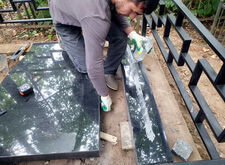 В начале ставим основание надгробья, верхнюю сторону которого промазываем клеем.
